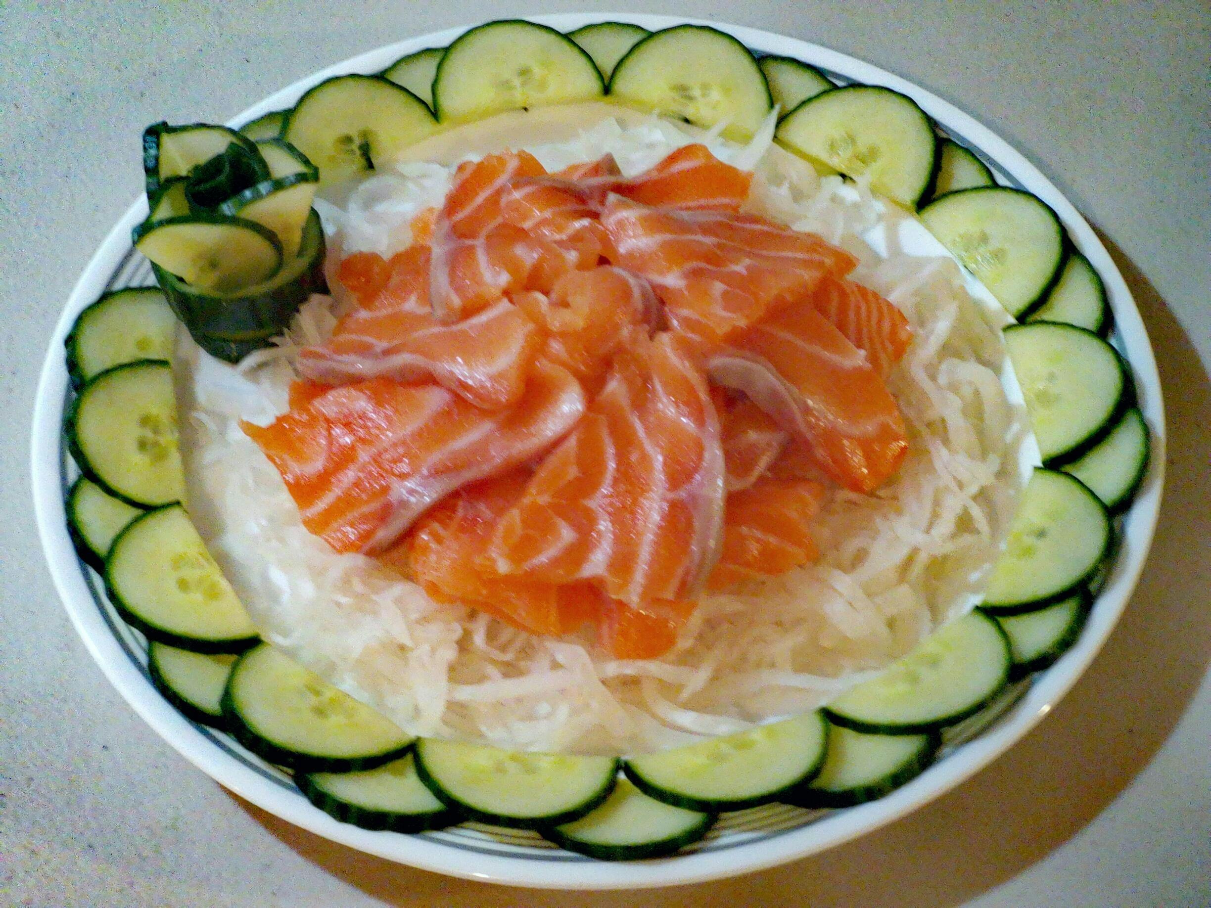 - Sashimi slices arranged with daikon, shiso, and a touch of wasabi.