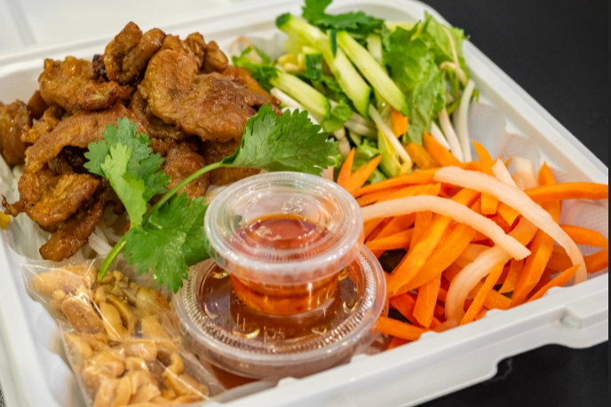 Grilled lemongrass pork served over vermicelli, accompanied by pickled radish, carrots, fresh lettuce, crushed peanuts, and house-signature fish sauce.