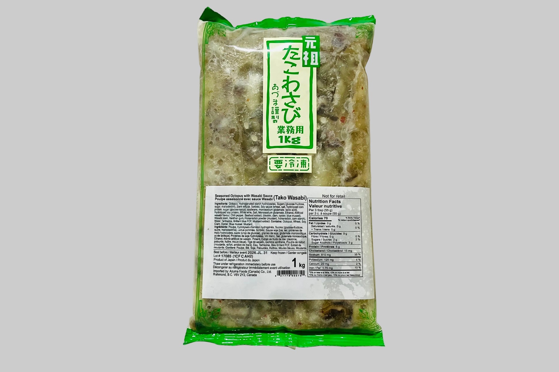 这款沙拉由可口的刺身级生章鱼小块制成,浸泡在芥末酱汁中,达到辛辣与鲜味的完美平衡。章鱼小块口感弹牙,味道独特,是一款很受欢迎的即食开胃菜。