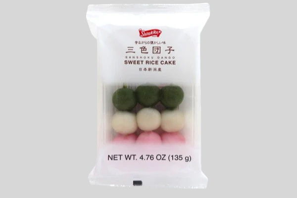 花见三色团子串由粉色、绿色、白色三色糯米粉团子串成,配有竹签,方便食用。樱花粉为春,白为冬,艾草绿为夏,串在竹签上,色彩鲜艳、造型可爱。每一口都柔软有嚼劲,带有淡淡的甜味,是茶歇时光、节日庆典或日常点心的绝佳选择。这是一款兼具美味与文化气息的日式甜品点心,让你轻松体验日本风情!